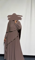 3 piece tunic set. Tunic is asymmetrical with balloon sleeve. Comes with overhead khimar and a skirt that has pockets.