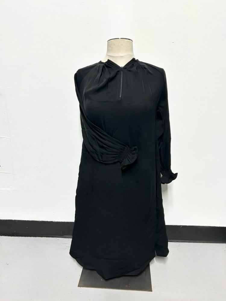 Aline with scrunch sleeve design. Does not come with scarf. Item cannot be hemmed please ensure you are purchasing correct length. Black only.