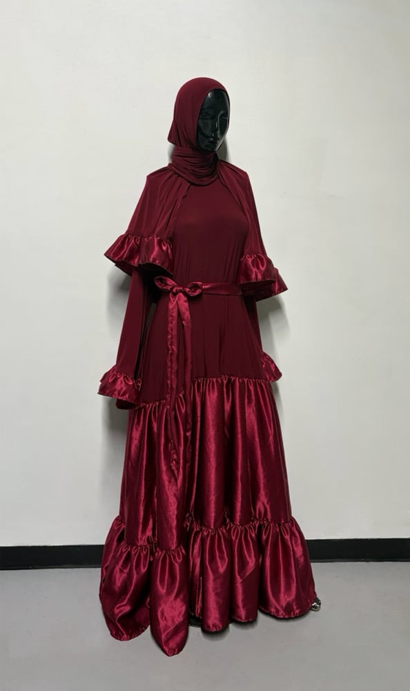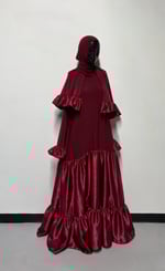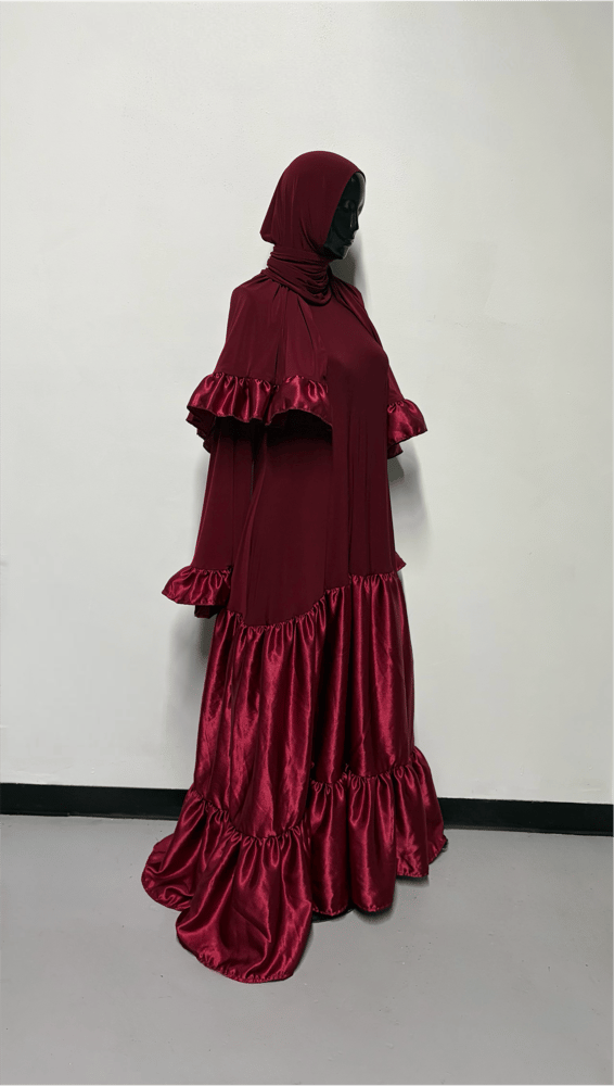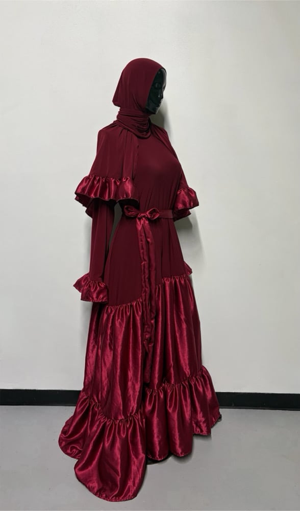 Double tier garment with ruffled sleeves and matching ruffled Shayla. Please put height in notes section upon checking out for hemming. Garment length is 66 and will be cut and hemmed to height.
