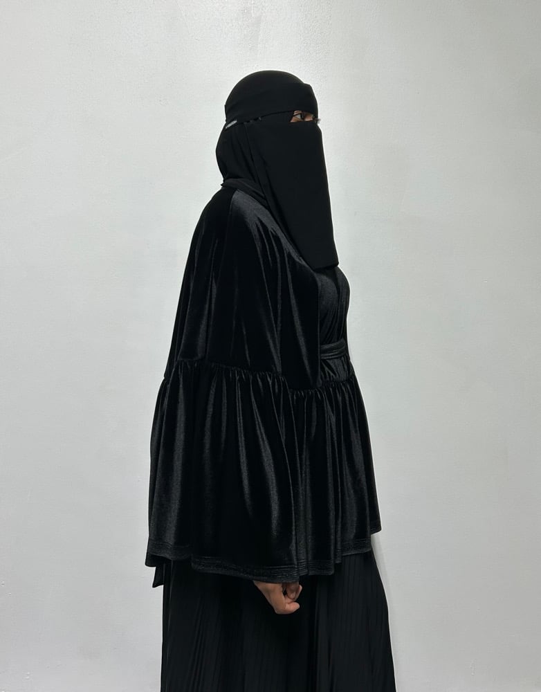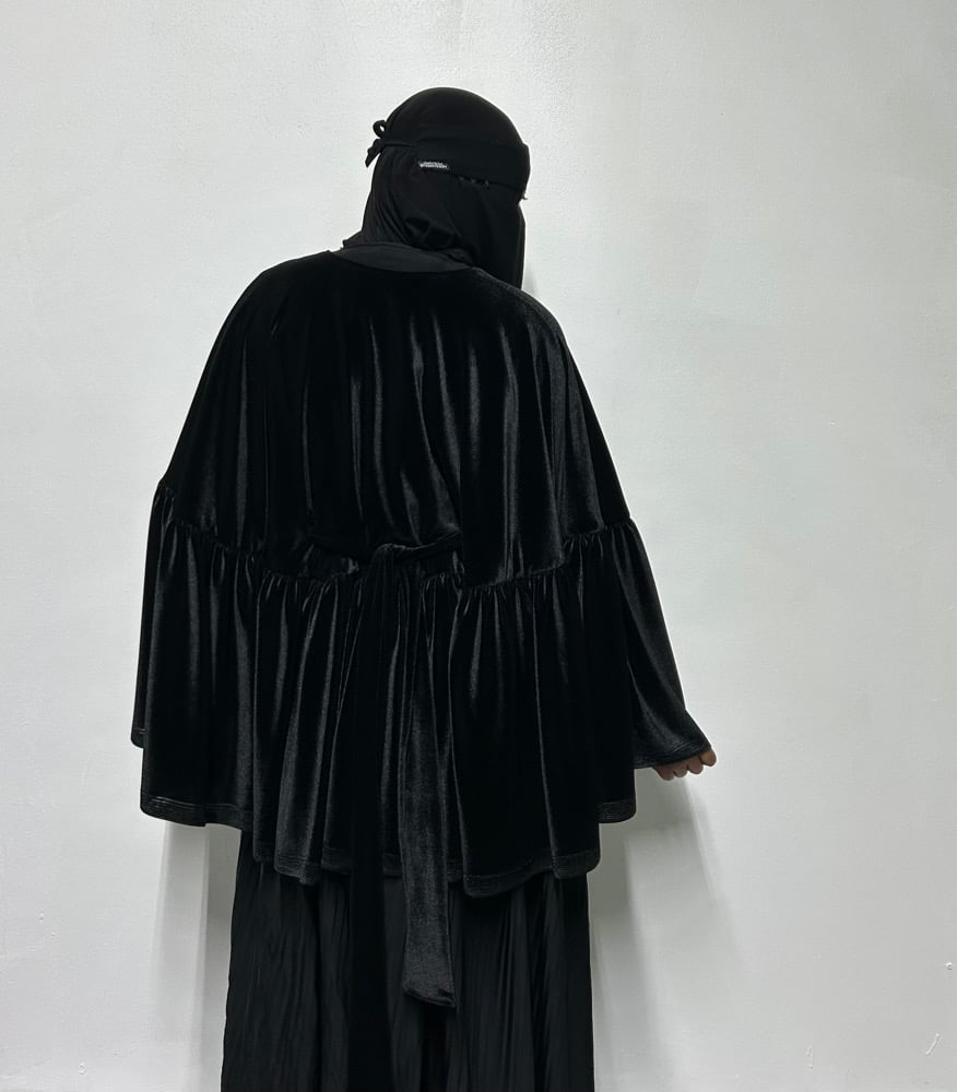 Velvet ruffled cape. One size fits all. Does not come with garment or scarf.