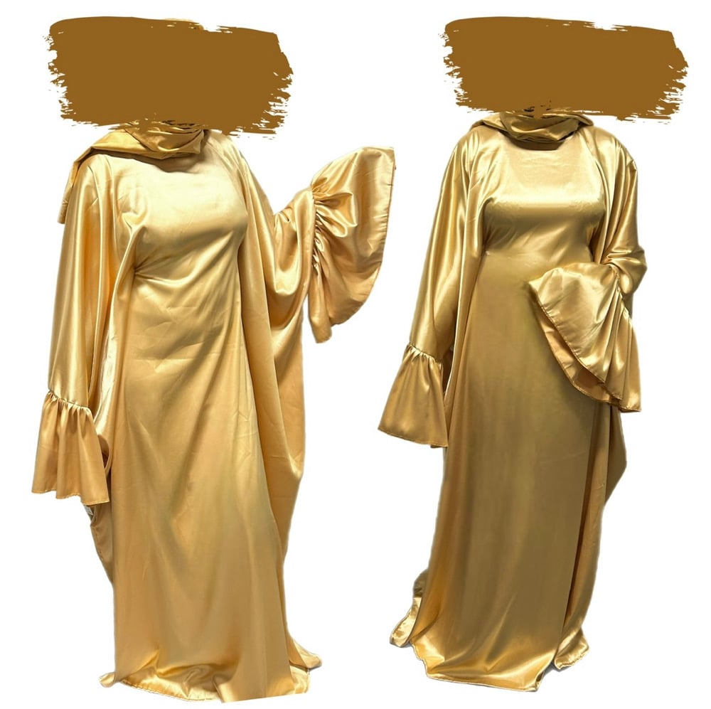 Satin kaftan with ruffled sleeves and matching ruffled Shayla.